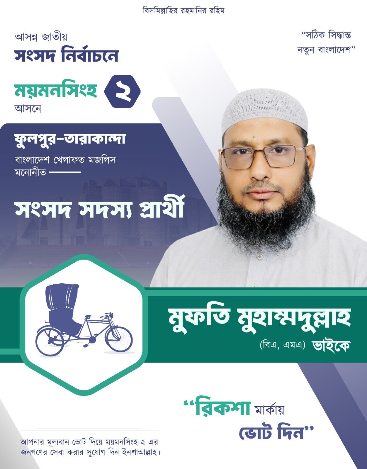 খেলাফত মজলিস মনোনীত রিকশা প্রতীকে ময়মনসিংহ -২ ফুলপুর তারাকান্দা আসনে সংসদ সদস্য পদপ্রার্থী মুফতি মুহাম্মদুল্লাহ'র ওয়েবসাইটে আপনাকে স্বাগতম।